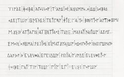 The palaeographic analysis of the letterform indicates an early, archaic date. The script used does not clearly match any local variant of the Greek alphabet: certain letter shapes indicate an origin in Attica or Euboea, while other letters point to the ductus common in western Asia Minor, particularly that of Knidos. Overall, the comparison with other early Greek documents suggests a creation of the text in the middle of the 6th century BC.[4]