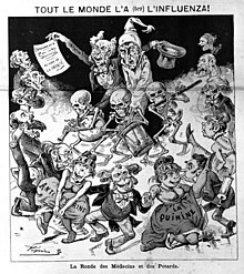 The 12 January 1890 edition of the Paris satirical magazine Le Grelot [fr] depicted an unfortunate person with influenza bowled along by a parade of physicians, druggists, skeleton musicians, and dancing women representing quinine and antipyrine.