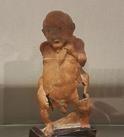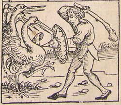 In art the scene was popular with little Pygmies armed with spears and slings, riding on the backs of goats, battling the flying cranes. The 2nd-century BC tomb near Panticapaeum, Crimea "shows the battle of human pygmies with a flock of herons".[1]