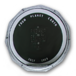 The disc was in a package in Buzz Aldrin's suit shoulder pocket along with some other memorial items. He was reminded about the package by Neil Armstrong while ascending the ladder of the Lunar Module Eagle to finish their EVA. He then dropped it to the surface.[2] Later Houston requested and received confirmation they had placed it.[3]Template:Apollo11series