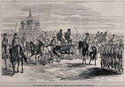 Russian nihilists tied to chairs on horse-drawn platforms and paraded past groups of soldiers on their way to execution in St. Petersburg