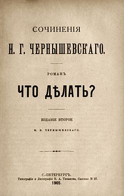 Chernyshevsky published his landmark 1863 novel What Is to Be Done? while being held at Peter and Paul Fortress as a political prisoner.[85] By an extraordinary failure of bureaucracy, government censors allowed the book to be published without any trouble despite it being the most openly revolutionary work of its era and a direct product of the suppression Chernyshevsky had faced.[86] The novel marked a significant departure for Chernyshevsky into utopian socialism.
