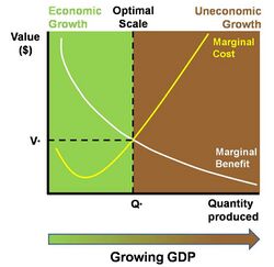 One theory that relates economic growth with quality of life is the "Threshold Hypothesis", which states that economic growth up to a point brings with it an increase in quality of life. But at that point – called the threshold point – further economic growth can bring with it a deterioration in quality of life.[132] This results in an upside-down-U-shaped curve, where the vertex of the curve represents the level of growth that should be targeted. Happiness has been shown to increase with GDP per capita, at least up to a level of $15,000 per person.[133]
