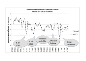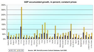 Economic growth in the United States slowed down after 1973.[34] In contrast, growth in Asia has been strong since then, starting with Japan and spreading to Four Asian Tigers, China , Southeast Asia, the Indian subcontinent and Asia Pacific.[35] In 1957 South Korea had a lower per capita GDP than Ghana,[36] and by 2008 it was 17 times as high as Ghana's.[37] The Japanese economic growth has slackened considerably since the late 1980s.