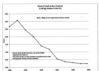 Increases in productivity lower the real cost of goods. Over the 20th century, the real price of many goods fell by over 90%.[17]