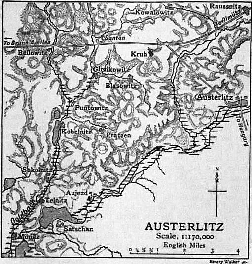 The great battle in which the French under Napoleon I. defeated the Austrians and Russians on the 2nd of December 1805, was fought in the country to the west of Austerlitz, the position of Napoleon’s left wing being almost equi-distant from Brünn and from Austerlitz. The wooded hills to the northward throw out to the south and south-west long spurs, between which are the low valleys of several rivers and brooks. The scene of the most important fighting was the Pratzen plateau. The famous “lakes” in the southern part of the field were artificial ponds, which have long since been drained. On the west or Brünn side of the Goldbach is another and lower ridge, which formed in the battle the first position of the French right and centre. On the other wing is the mass of hills from which the spurs and streams descend: here the Olmütz-Brünn road passes. The road from Brunn to Vienna, Napoleon’s presumed line of retreat, runs in a southerly direction, and near the village of Raigern (3 m. west of Monitz) is very close to the extreme right of the French position, a fact which had a great influence on the course of the battle. (The course of events which led to the action is described under Napoleonic Campaigns.) Napoleon, falling back before the advance of the allied Austrians and Russians from Olmütz, bivouacked west of the Goldbach, whilst the allies, holding, near Austerlitz, the junction of the roads from Olmutz and from Hungary, formed up in the valleys east of the Pratzen heights. The cavalry of both sides remained inactive, Napoleon’s by express order, the enemy’s seemingly from mere negligence, since they had 177 squadrons at their disposal. Napoleon, having determined to fight, as usual called up every available battalion; the splendid III. corps of Davout only arrived upon the field after a heavy march, late on the night of December 1st. The plan of the allies was to attack Napoleon’s right, and to cut him off from Vienna, and their advanced guard began, before dark on the 1st of December, to skirmish towards Telnitz. At that moment Napoleon was in the midst of his troops, thousands of whom had made their bivouac-straw into torches in his honour. The glare of these seemed to the allies to betoken the familiar device of lighting fires previous to a retreat, and thus confirmed them in the impression which Napoleon’s calculated timidity had given. Thus encouraged, those who desired an immediate battle soon gained the upper hand in the councils of the tsar and the emperor Francis. The attack orders for the 2nd of December (drawn up by the Austrian general Weyrother, and explained by him to a council of superior officers, of whom some were hostile, the greater part indifferent, and the chief Russian member, General Kutusov, asleep) gave the five columns and the reserve, into which the Austro-Russian army was organized, the following tasks: the first and second (Russians) to move south-westward behind the Pratzen ridge towards Telnitz and Sokolnitz; the third (Russian) to cross the southern end of the plateau, and come into line on the right of the first two; the fourth (Austrians and Russians under Kolowrat) on the right of the third to advance towards Kobelnitz. An Austrian advanced guard preceded the 1st and 2nd columns. Farther still on the right the 5th column (cavalry under Prince John of Liechtenstein) was to hold the northern part of the plateau, south of the Brunn-Olmutz road; across the road itself was the corps of Prince Bagration, and in rear of Liechtenstein’s corps was the reserve (Russians under the grand-duke Constantine). Thus, the farther the four main columns penetrated into the French right wing, the wider would the gap become between Bagration and Kolowrat, and Liechtenstein’s squadrons could not form a serious obstacle to a heavy attack of Napoleon’s centre. The whole plan was based upon defective information and preconceived ideas; it has gone down to history as a classical example of bad generalship, and its author Weyrother, who was perhaps nothing worse than a pedant, as a charlatan.