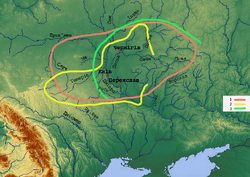Ruthenia[lower-alpha 1] is an exonym, originally used in Medieval Latin, as one of several terms for Rus'.[1] Originally, the term Rus' land referred to a triangular area, which mainly corresponds to the tribe of Polans in Dnieper Ukraine.[2]Ruthenia was used to refer to the East Slavic and Eastern Orthodox people of the Grand Duchy of Lithuania and the Kingdom of Poland, and later the Polish-Lithuanian Commonwealth and Austria-Hungary, mainly to Ukrainians and sometimes Belarusians, corresponding to the territories of modern Belarus, Ukraine, Eastern Poland and some of western Russia.[3][4][5][6]