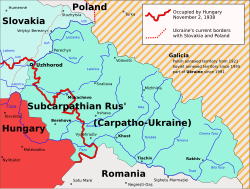 Map of the areas claimed and controlled by the Carpathian Ruthenia, the Lemko Republic and the West Ukrainian People's Republic in 1918Autonomous Subcarpathian Ruthenia and independent Carpatho-Ukraine 1938–1939.