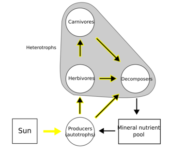 A simplified food web illustrating a three-trophic food chain (producers-herbivores-carnivores) linked to decomposers. The movement of mineral nutrients through the food chain, into the mineral nutrient pool, and back into the trophic system illustrates ecological recycling. The movement of energy, in contrast, is unidirectional and noncyclic.[15][16]