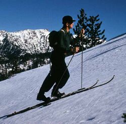Climbing skins are strips that attach to the bottom of Nordic, alpine touring or randonnée skis to help while ascending backcountry slopes. They are designed to be removed for skiing downhill. They are typically attached to the skis via a loop on the ski tip, a hook on the tail, and adhesive on the base of the skin. They are called skins because they resemble sealskin, from which the first ski skins were made.[1] They are typically made from nylon or mohair or a combination thereof, and are designed to let the ski slide forward on snow but not backward.[2][3] They are usually narrower than the ski to allow the ski edges to get a grip. Some ski resorts permit skinning.[4][5]