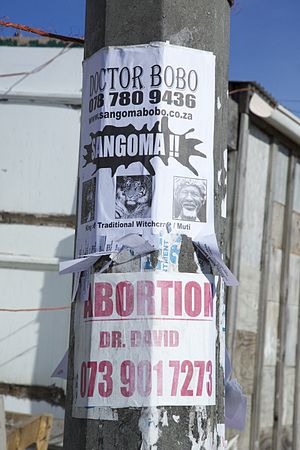 They advertise through flyers, posters and adverts that are commonly plastered on the streets and lamposts of cities throughout South Africa, especially in densely populated urban areas.[76] The adverts make outlandish promises and claims about spells that bring back lost lovers, potions to enlarge penises and spells that will make people rich or provide them with luck to win in gambling or the lottery, to name a few. The sophistication of their advertising also extends to advertising in local newspapers and internet websites.[76][77][78] Many people have lost significant amounts of money from scams, tricks and false promises that these charlatans use in their cons.[77][78][79][80] Many women have significantly damaged their reproductive organs and the ability to reproduce, due to back street abortions.[81]