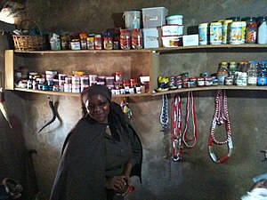 A sangoma is a practitioner of ngoma, a philosophy based on a belief in ancestral spirits (Zulu: amadlozi; Sesotho: badimu; Xhosa: izinyanya) and the practice of traditional African medicine, which is often a mix of medicinal plants and various animal body fats or skin.[11][12] Sangomas perform a holistic and symbolic form of healing by drawing on the embedded beliefs of the Bantu peoples in South Africa, who believe that ancestors in the afterlife guide and protect the living.[13] Sangomas are called to heal, and through them it is believed that ancestors from the spirit world can give instruction and advice to heal illness, social disharmony and spiritual difficulties.[14] Traditional healers work in a sacred healing hut or indumba, where they believe their ancestors reside.[15] Where no physical 'indumba' is available, a makeshift miniature sacred place called imsamo can be used.
