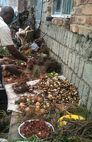 Traditional healers of South Africa are practitioners of traditional African medicine in Southern Africa. They fulfill different social and political roles in the community, including divination, healing physical, emotional and spiritual illnesses, directing birth or death rituals, finding lost cattle, protecting warriors, counteracting witchcraft, and narrating the history, cosmology, and myths of their tradition. There are two main types of traditional healers within the Nguni, Sotho-Tswana, and Tsonga societies of Southern Africa: the diviner (sangoma), and the herbalist (inyanga). These healers are effectively South Africa n shamans who are highly revered and respected in a society where illness is thought to be caused by witchcraft, pollution (contact with impure objects or occurrences) or through neglect of the ancestors.[1][2] It is estimated that there are as many as 200,000 indigenous traditional healers in South Africa compared to 25,000 Western-trained doctors.[3] Traditional healers are consulted by approximately 60% of the South African population, usually in conjunction with modern biomedical services.[4]