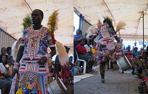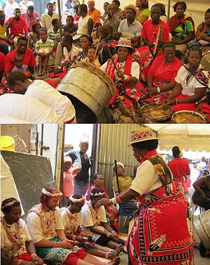 During the training period the ithwasa will share their ailments in the form of song and dance, a process that is nurtured by the analysis of dreams, anxieties, and with prayer. The story develops into a song which becomes a large part of the graduation-type ceremony that marks the end of the ithwasa's training.[39] At times in the training, and for the graduation, a ritual sacrifice of an animal is performed (usually chickens and a goat or a cow).[40][41]