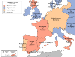 The Western Schism, also known as the Papal Schism, the Great Occidental Schism, or the Schism of 1378 (Latin: Magnum schisma occidentale, Ecclesiae occidentalis schisma), was a split within the Catholic Church lasting from 1378 to 1417 in which bishops residing in Rome and Avignon both claimed to be the true pope, and were joined by a third line of Pisan claimants in 1409. The schism was driven by personalities and political allegiances, with the Avignon papacy being closely associated with the French monarchy.