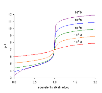 is not close to 7, as with a strong acid, but depends on the acid dissociation constant, Ka, of the acid. The pH at the end-point or equivalence point in a titration may be calculated as follows. At the end-point the acid is completely neutralized so the analytical hydrogen ion concentration, TH, is zero and the concentration of the conjugate base, A−, is equal to the analytical or formal concentration TA of the acid: [A−] = TA. When a solution of an acid, HA, is at equilibrium, by definition the concentrations are related by the expression