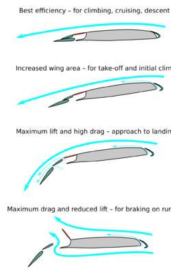 Flaps (green) are used in various configurations to increase the wing area and to increase the lift. In conjunction with spoilers (red), flaps maximize drag and minimize lift during the landing roll.