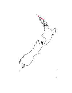 Anisoura nicobarica are endemic to the Far North of New Zealand. In 1948 a specimen was found at Orokawa Bay in the Bay of Islands.[8] Most subsequent sightings have come from the Hokianga region.[8] Most sightings involve only a single individual, making their abundance hard to determine. Northland tusked wētā are nocturnal and during the day they hide in tree holes and cover the entrance, making them hard to find.[11]