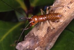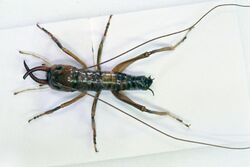 Tusked wētā are distinctive because of the long curved "tusks" adult males have projecting forward from their jaws. The tusks are not used for biting but are used to push an opponent.[6] Among the three species of tusked wētā, the Northland tusked wētā, Anisoura nicobarica, is the smallest measuring up to 21mm in body length. The Middle Island tusked wētā, Motuweta isolata, being the biggest measuring up to 70 mm in body length and the Raukumara tusked wētā, Motuweta riparia, is 30–40 mm long.[6][7] The Northland tusked wētā is reddish brown and their hind tibia contains small spines.[8] The tusks are devoid of stridulatory ridges, which are a feature of both M. isolata and A. nicobarica[9]. Unlike ground wētā (Hemiandrus sp.), tusked wētā have ears on their front legs (fore-tibia).