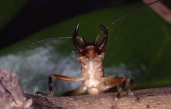 Anisoura nicobarica lives in tree holes (galleries), while the other two species of tusked wētā are ground burrowers, and all three face outward while occupying the retreat.[13] As a defence tactic the tusked wētā orients itself to face the opening of its gallery with its jaws agape.[14][9] They also mix their saliva with wood scrapings to seal the entrance of their gallery making the aperture almost invisible which is especially important during their moult.[9] A captive A. nicobarica has been recorded creating a burrow in soil and roofing it with debris which suggests they can be flexible over their selection of refuges.[15][9] When any of the tusked wētā are provoked further they display " mandible gape", "raise foreleg" and "raise head" which closely resemble a suit of components displayed by Hemideina species.[9] According to Bellingham, M. (1991) during a field observation stated "when disturbed, they raised their tusks slightly, rasping them together. The body was curved sideways[9] with the front and head elevated. The hind legs were not raised. The weta also made short lunges forward attempting to use its tusks as pincers. When disturbed further, by blowing or tapping lightly on its head, the weta jumped away[14] haphazardly".[16]