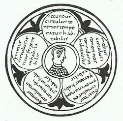 Bishop Isidore of Seville (560–636) taught in his widely read encyclopedia, the Etymologies, diverse views such as that the Earth "resembles a wheel"[92] resembling Anaximander in language and the map that he provided. This was widely interpreted as referring to a disc-shaped Earth.[93][94] An illustration from Isidore's De Natura Rerum shows the five zones of the Earth as adjacent circles. Some have concluded that he thought the Arctic and Antarctic zones were adjacent to each other.[95] He did not admit the possibility of antipodes, which he took to mean people dwelling on the opposite side of the Earth, considering them legendary[96] and noting that there was no evidence for their existence.[97] Isidore's T and O map, which was seen as representing a small part of a spherical Earth, continued to be used by authors through the Middle Ages, e.g. the 9th-century bishop Rabanus Maurus, who compared the habitable part of the northern hemisphere (Aristotle's northern temperate clime) with a wheel. At the same time, Isidore's works also gave the views of sphericity, for example, in chapter 28 of De Natura Rerum, Isidore claims that the Sun orbits the Earth and illuminates the other side when it is night on this side. See French translation of De Natura Rerum.[98] In his other work Etymologies, there are also affirmations that the sphere of the sky has Earth in its center and the sky being equally distant on all sides.[99][100] Other researchers have argued these points as well.[6][101][102] "The work remained unsurpassed until the thirteenth century and was regarded as the summit of all knowledge. It became an essential part of European medieval culture. Soon after the invention of typography it appeared many times in print."[103] However, "The Scholastics – later medieval philosophers, theologians, and scientists – were helped by the Arabic translators and commentaries, but they hardly needed to struggle against a flat-Earth legacy from the early middle ages (500–1050). Early medieval writers often had fuzzy and imprecise impressions of both Ptolemy and Aristotle and relied more on Pliny, but they felt (with one exception), little urge to assume flatness."[6]