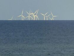 An image of Thorntonbank Wind Farm (near the Belgian coast) with the lower parts of the more distant towers increasingly hidden by the horizon, demonstrating the curvature of the Earth