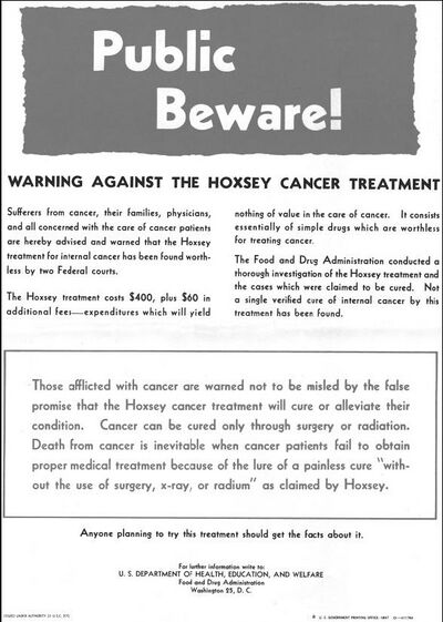 From Handwiki Hoxsey Therapy or Hoxsey Method is an alternative medical treatment promoted as a cure for cancer. The treatment consists of a caustic herbal paste for external cancers or a herbal mixture for "internal" cancers, combined with laxatives, douches, vitamin supplements, and dietary changes. Reviews by major medical bodies, including the U.S. Food and Drug Administration (FDA), the National Cancer Institute, the American Cancer Society,[1] M. D. Anderson Cancer Center,[2] and Memorial Sloan-Kettering Cancer Center,[3] have found no evidence that Hoxsey Therapy is an effective treatment for cancer. The sale or marketing of the Hoxsey Method was banned in the United States by the FDA on September 21, 1960 as a "worthless and discredited" remedy and a form of quackery.[4]