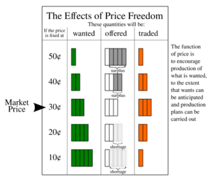 A free price system or free price mechanism (informally called the price system or the price mechanism) is a mechanism of resource allocation that relies upon prices set by the interchange of supply and demand. The resulting price signals communicated between producers and consumers determine the production and distribution of resources. Therefore the free price system rations supplies, distributes income, and allocates resources.