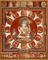 In the mandala, the outer circle of fire usually symbolises wisdom. The ring of eight charnel grounds[13] represents the Buddhist exhortation to be always mindful of death, and the impermanence with which samsara is suffused: "such locations were utilized in order to confront and to realize the transient nature of life".[14] Described elsewhere: "within a flaming rainbow nimbus and encircled by a black ring of dorjes, the major outer ring depicts the eight great charnel grounds, to emphasize the dangerous nature of human life".[15] Inside these rings lie the walls of the mandala palace itself, specifically a place populated by deities and Buddhas.
