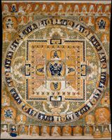 An example of this type of mandala is Vajrabhairava mandala a silk tapestry woven with gilded paper depicting lavish elements like crowns and jewelry, which gives a three-dimensional effect to the piece.[8][9]