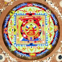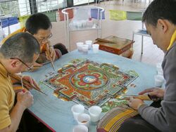 Sand mandalas are colorful mandalas made from sand that are ritualistically destroyed. They originated in India in the 8th–12th century but are now practiced in Tibetan Buddhism.[24] Each mandala is dedicated to specific deities. In Buddhism Deities represent states of the mind to be obtained on the path to enlightenment, the mandala itself is representative of the deities palace which also represents the mind of the deity.[24] Each mandala is a pictorial representation of a tantra. for the process of making Sand mandalas they are created by monks who have trained for 3–5 years in a monastery.[25] These sand mandalas are made to be destroyed to symbolize impermanence, the Buddhist belief that death is not the end, and that one's essence will always return to the elements. It is also related to the belief that one should not become attached to anything.[26] To create these mandalas, the monks first create a sketch,[27] then take colorful sand traditionally made from powdered stones and gems into copper funnels called Cornetts[25] and gently tap sand out of them to create the sand mandala. Each color represents attributes of deities. While making the mandalas the monks will pray and meditate, each grain of sand represents a blessing.[26] Monks will travel to demonstrate this art form to people, often in museums.