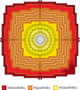 Whereas the above mandala represents the pure surroundings of a Buddha, this mandala represents the universe. This type of mandala is used for the mandala-offerings, during which one symbolically offers the universe to the Buddhas or to one's teacher. Within Vajrayana practice, 100,000 of these mandala offerings (to create merit) can be part of the preliminary practices before a student even begins actual tantric practices.[22] This mandala is generally structured according to the model of the universe as taught in a Buddhist classic text the Abhidharma-kośa, with Mount Meru at the centre, surrounded by the continents, oceans and mountains, etc.