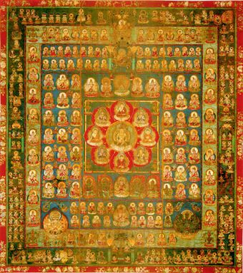 Painted Bhutanese Medicine Buddha mandala with the goddess Prajnaparamita in center, 19th century, Rubin Museum of Art