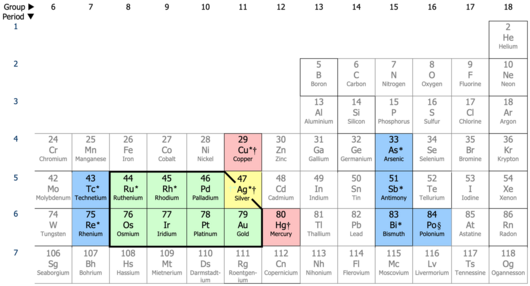 Periodic table extract showing approximately how often each element tends to be recognized as a noble metal: 7 most often (Ru, Rh, Pd, Os, Ir, Pt, Au)[1]1 often (Ag)[2]2 sometimes (Cu, Hg)[3]6 in a limited sense (Tc, Re, As, Sb, Bi, Po) The thick black line encloses the seven to eight metals most often to often so recognized. Silver is sometimes not recognized as a noble metal on account of its greater reactivity.[4] * may be tarnished in moist air or corrode in an acidic solution containing oxygen and an oxidant † attacked by sulfur or hydrogen sulfide § self-attacked by radiation-generated ozone