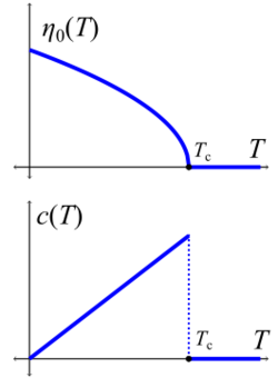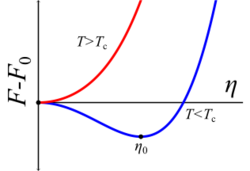 It is clear that this solution only exists for [math]\displaystyle{ T\lt T_c }[/math], otherwise [math]\displaystyle{ \eta= 0 }[/math] is the only solution. Indeed, [math]\displaystyle{ \eta= 0 }[/math] is the minimum solution for [math]\displaystyle{ T\gt T_c }[/math], but the solution [math]\displaystyle{ \eta_0 }[/math] minimizes the free energy for [math]\displaystyle{ T\lt T_c }[/math], and thus is a stable phase. Furthermore, the order parameter follows the relation
