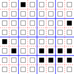 A block cellular automaton is an automaton at which, in each time step, the cells of the automaton are partitioned into congruent subsets (called blocks), and the same transformation is applied independently to each block. Typically, such an automaton will use more than one partition into blocks, and will rotate between these partitions at different time steps of the system.[10] In a frequently used form of this design, called the Margolus neighborhood, the cells of the automaton form a square grid and are partitioned into larger 2 × 2 square blocks at each step. The center of a block at one time step becomes the corner of four blocks at the next time step, and vice versa; in this way, the four cells in each 2 × 2 belong to four different 2 × 2 squares of the previous partition.[11] The Critters rule discussed above is an example of this type of automaton.