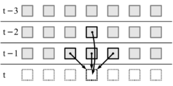 A cellular automaton is defined by its cells (often a one- or two-dimensional array), a finite set of values or states that can go into each cell, a neighborhood associating each cell with a finite set of nearby cells, and an update rule according to which the values of all cells are updated, simultaneously, as a function of the values of their neighboring cells. The simplest possible cellular automata have a one-dimensional array of cells, each of which can hold a binary value (either 0 or 1), with each cell having a neighborhood consisting only of it and its two nearest cells on either side; these are called the elementary cellular automata.[2] If the update rule for such an automaton causes each cell to always remain in the same state, then the automaton is reversible: the previous state of all cells can be recovered from their current states, because for each cell the previous and current states are the same. Similarly, if the update rule causes every cell to change its state from 0 to 1 and vice versa, or if it causes a cell to copy the state from a fixed neighboring cell, or if it causes it to copy a state and then reverse its value, it is necessarily reversible.[3] (Toffoli Margolus) call these types of reversible cellular automata, in which the state of each cell depends only on the previous state of one neighboring cell, "trivial". Despite its simplicity, the update rule that causes each cell to copy the state of a neighboring cell is important in the theory of symbolic dynamics, where it is known as the shift map.[4]