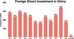 FDI in China, also known as RFDI (renminbi foreign direct investment), has increased considerably in the last decade, reaching $19.1 billion in the first six months of 2012, making China the largest recipient of foreign direct investment at that point of time and topping the United States which had $17.4 billion of FDI.[16] In 2013 the FDI flow into China was $24.1 billion, resulting in a 34.7% market share of FDI into the Asia-Pacific region. By contrast, FDI out of China in 2013 was $8.97 billion, 10.7% of the Asia-Pacific share.[17] During the global financial crisis FDI fell by over one-third in 2009 but rebounded in 2010.[18] China implemented the Foreign Investment Law[19] in 2020.