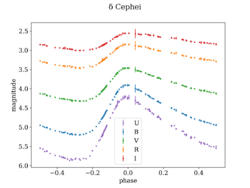 Phase-folded UBVRI light curves of Delta Cephei, prototype of the classical Cepheids, showing magnitude versus pulsation phase