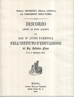- 1884 – Della Necessità della Lingua al Progresso dell’Uomo (On the Need of Language for the Progress of Man).[2] A 20-page pamphlet in Italian published in Malta (Zefirino Micallef Tipografia) in which Farrugia elaborates on various literary themes around the concept of human progress. The work reproduces a talk given by Farrugia on September 6, 1884, at Flores College, Valletta. Throughout the talk he cites various authors, such as Dante, Manicino, Soave, Blames and others.