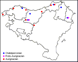 The Evolved Aurignacian is found mainly in Biscay and Gipuzkoa, at the sites of Lezetxiki, Aiztbitaterte IV, Koskobilo, Benta-Laperra, Kurtzia and Lumentxa.