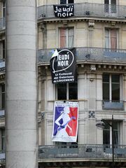 On 11 January 2007, activists from several associations, in particular Droit Au Logement (DAL or ), Collectif Jeudi Noir () and Macaq (abbreviation of Mouvement d’Animation Culturelle et Artistique de Quartier ()), denounced the inaction of the public authorities in the housing crisis by inaugurating a fake "Ministry of Housing Crisis" in the 2nd arrondissement of Paris, in the corner of Place de la Bourse and rue de la Banque. A poster diverting the logo of the government was displayed by adding a crowbar and a bunch of keys.[29]