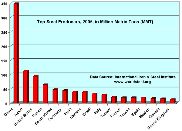 China is currently the largest producer of steel in the world. Steel is currently the most recycled material in the world, the industry estimates that of new metal produced each year some 42.3% is recycled material. All steel that is available is currently recycled, the long service life of steel in applications such as construction means that there is a vast 'store' of steel in use that is recycled as it becomes available. But new metal derived from raw materials is also necessary to make up demand.