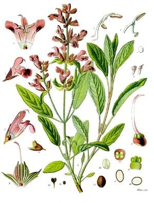 The strongest active constituents of common sage are within its essential oil, which contains cineole, borneol, and thujone. Sage leaf contains tannic acid, oleic acid, ursonic acid, ursolic acid, cornsole, cornsolic acid, fumaric acid, chlorogenic acid, saponin, caffeic acid, niacin, nicotinamide, flavones, flavone glycosides, and estrogenic substances (AHS 2007; Longe 2005). Sage also is high in calcium, and provides potassium, magnesium, zinc, vitamin C, and the B vitamins.