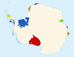 Ice shelves are attached to a large portion of the Antarctic coastline. Their total area is 1,541,700 km2.[1] Names are also listed in the Scientific Committee on Antarctic Research, Gazetteer.[2] The ice shelf areas are listed below, clockwise, starting in the west of East Antarctica: