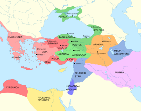 ![]() The Roman empire in the time of Hadrian (117–138 AD), with the imperial province of Cappadocia highlighted. | |||||||||