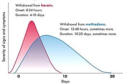 Common side effects include respiratory depression (decreased breathing), dry mouth, drowsiness, impaired mental function, constipation, and addiction.[7] Use by injection can also result in abscesses, infected heart valves, blood-borne infections, and pneumonia.[7] After a history of long-term use, opioid withdrawal symptoms can begin within hours of the last use.[7] When given by injection into a vein, heroin has two to three times the effect of a similar dose of morphine.[5] It typically appears in the form of a white or brown powder.[7]
