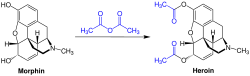 Diamorphine is produced from acetylation of morphine derived from natural opium sources, generally using acetic anhydride.[82]