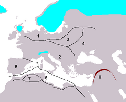 It has been estimated that the Bering Land Bridge was inundated around 8500 BC by the rising sea levels so that North America and Asia were again separated by the waters of the Bering Strait and the Chukchi Sea.[3] It is generally believed that there was a migration across the land bridge from eastern Siberia into North America during the Last Glacial Maximum. Sometime after the American glaciers melted, these peoples expanded southward into the wider continent to become the Native Americans. After the land bridge was inundated by the rising sea water, no further migration was possible from Siberia.[4][5]