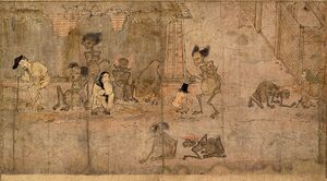 Pretas are often depicted in Japanese art (particularly that from the Heian period) of Gaki-Zoshi as emaciated human-like creatures with bulging stomachs with dependable size and rather thin throats. They are frequently shown licking up spilled water in temples, accompanied by demon (specifically oni), desperately begging to humans, and scavenging things, or winding up in severe pain representing their personal agony. Otherwise they may be shown as balls of smoke or fire. Often, pretas are usually depicted naked and while others wears fundoshi. [citation needed]